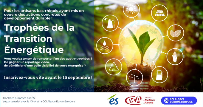 Pour les artisans Bas-Rhinois ayant mis en oeuvre des actions concrètes de développement durable, inscrivez-vous pour tenter de remporter l'un des 4 trophées et gagner un reportage vidéo, et ainsi bénéficier d'une meilleure visibilité pour votre entreprise.